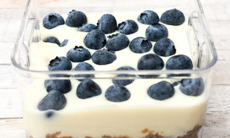 - In a separate bowl, mix the protein yogurt with blueberries.