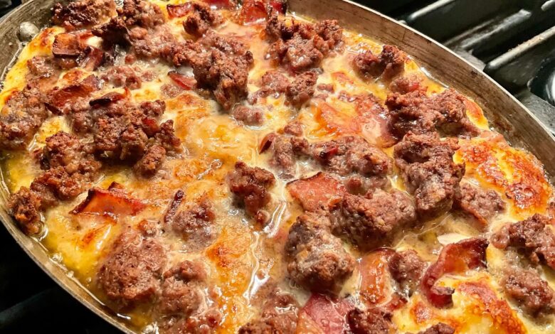 Pour the egg–cream–Parmesan mixture evenly over the cooked beef and bacon layer.