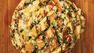 This Spinach Artichoke Pull-Apart Bread! A loaf of buttery bread sliced and stuffed with melty, cheese spinach artichoke dip and…