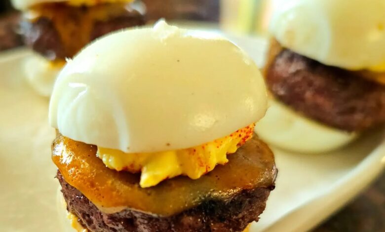 - Assemble the Deviled Egg Hamburgers: Place a cooked burger patty on a plate. Spoon a generous amount of the deviled egg filling on top. Optionally, add crispy bacon and garnish with fresh herbs like chives or parsley for extra flavor.