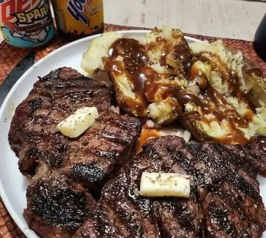 Perfectly grilled ribeye steak with a savory, caramelized crust, topped with melting butter and served alongside smashed potatoes with rich brown gravy. A hearty, classic lunch that’s both comforting and indulgent.