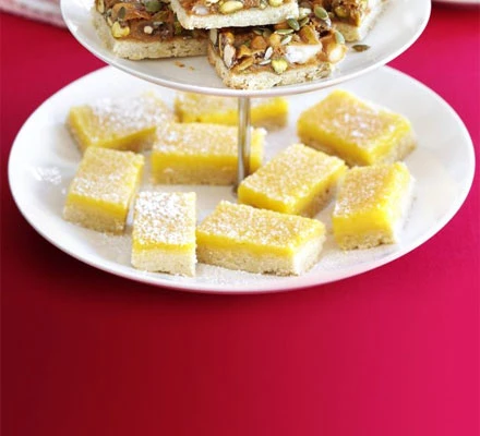 Remove the tin and lower oven to 180C/160C fan/gas 4. Mix the lemon juice and eggs, then sieve into a bowl with the sugar, flour and zest. Whisk to combine, pour over the base, then bake for 10-15 mins until the top is just set. Cool in the tin, dust with icing sugar, then slice.